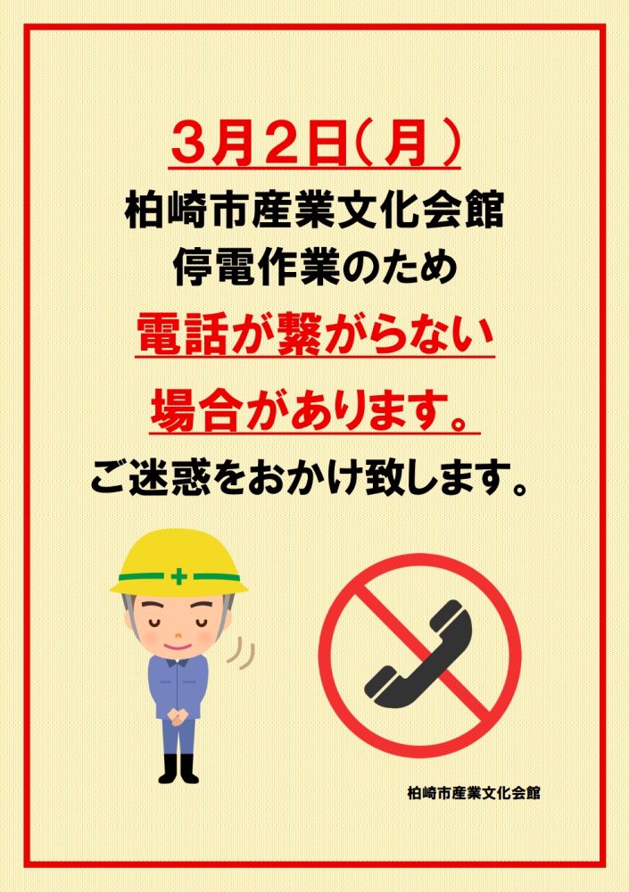 3/2(月)停電作業に伴い、終日、電話が繋がらない場合があります。